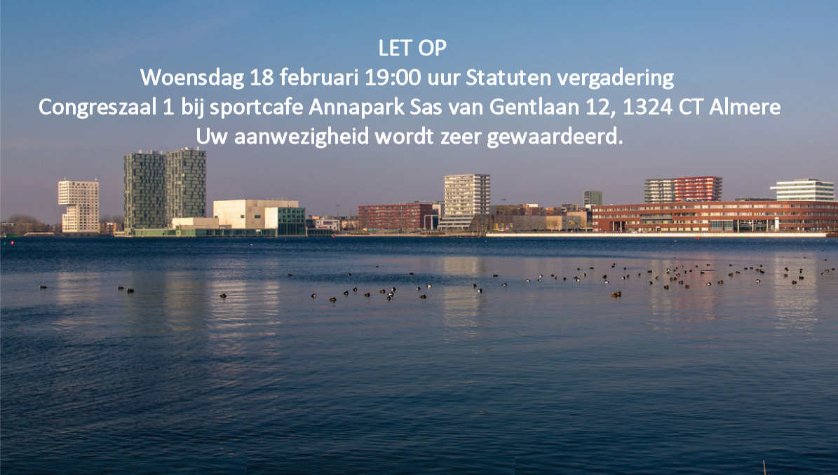Woensdag 18 februari 19:00 uur Statuten vergadering Congreszaal 1 bij sportcafe Annapark Sas van Gentlaan 12, 1324 CT Almere
